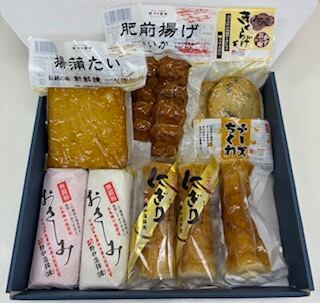 ・おさしみ蒲鉾×2本(赤1本・白1本)・にぎりちくわ×2本 ・新鮮煉揚蒲たい×1個 ・チーズちくわ1袋・肥前揚げ1袋 ・おかず庵1袋 ※包装して箱詰めにてお送りいたします。