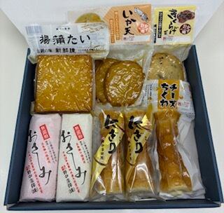 ・おさしみ蒲鉾×2本(赤1本・白1本) ・にぎりちくわ×2本 ・チーズちくわ×1本 ・新鮮煉揚蒲たい×1個 ・おかず庵×2袋 ※箱詰めにてお送りいたします。
